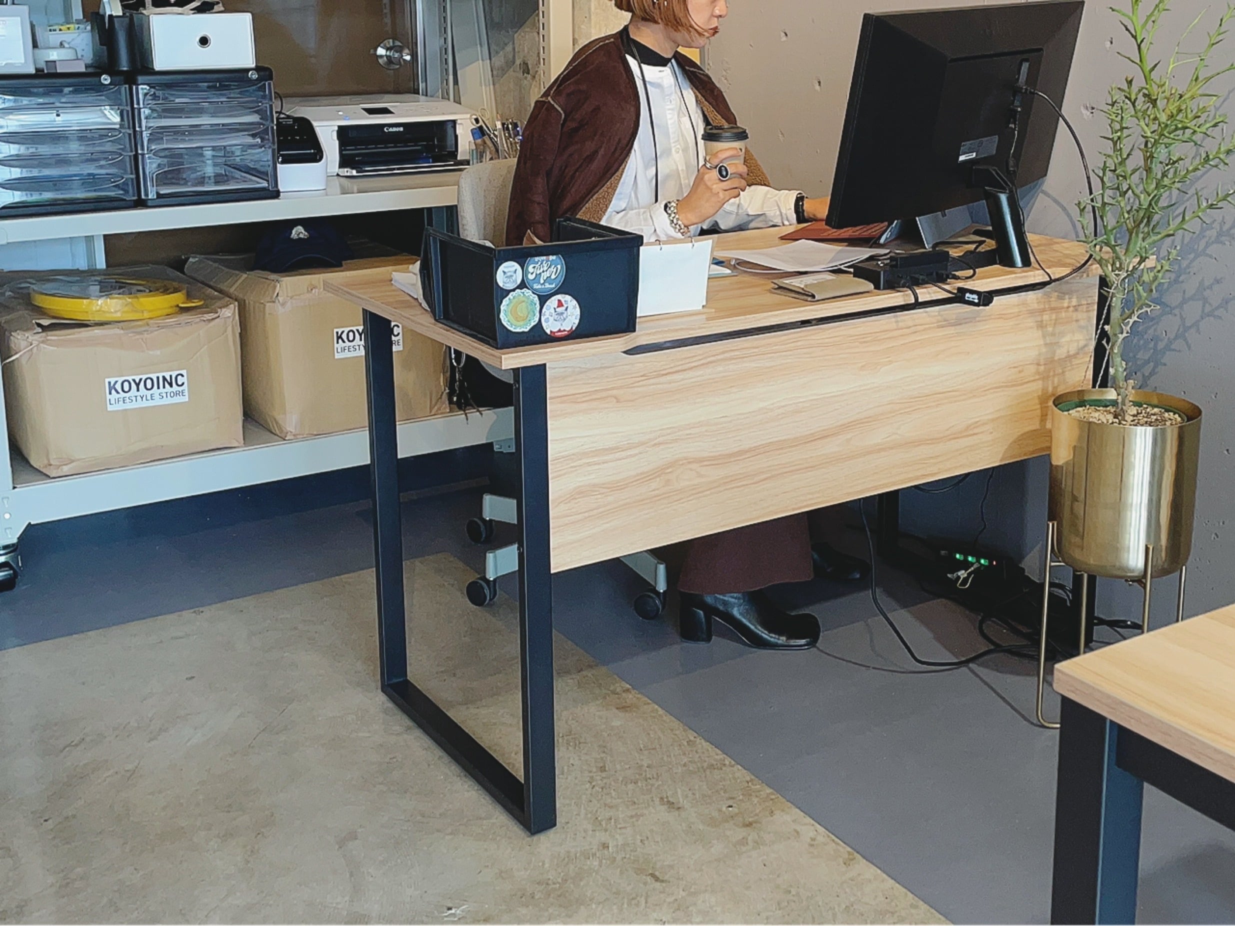 木目天板に黒脚のシンプルでスマートな平デスクです。