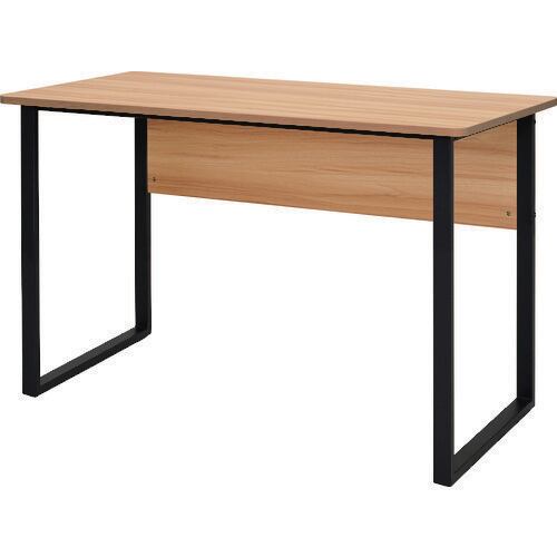 A simple and smart flat desk with black legs on a wood grain top board.